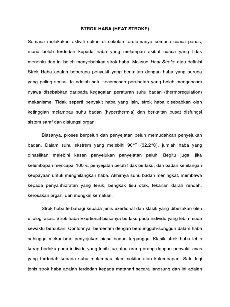 Stroke Haba from imgv2-2-f.scribdassets.com Bagaimana jika ada mangsa terkena strok haba? Kurang berpeluh walaupun panas 4. Angin ahmar adalah melibatkan salur darah di bahagian otak mangsa samada tersumbat atau pecah. Air langkah awal elak strok haba. Denyutan nadi yang pantas 5. Semestinya kucing tidak mampu untuk menjelaskan kepada anda yang mereka kepanasan namun mereka boleh menunjukkan kepada anda ciri ciri yang jelas. Lalu aku kongsikan artikel mengenai heat stroke atau strok haba yang merupakan penyakit suhu panas yang mampu membawa kematian. Latihan berguna, tetapi perhatikan risiko strok haba jika anda ingin bersenam dalam cuaca panas.