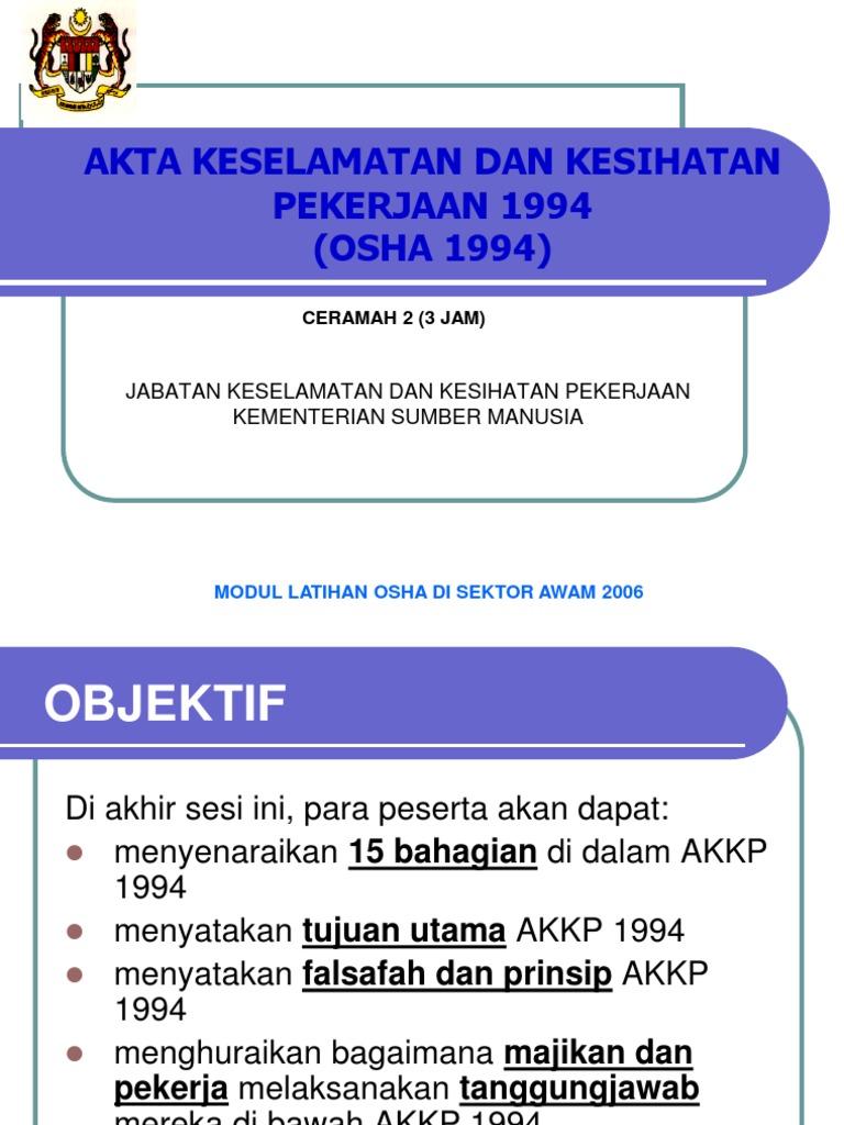 Akta Keselamatan Dan Kesihatan Pekerjaan 1994 : Akta keselamatan dan kesihatan pekerjaan 1994.. Dipaparkan pada 27 september 2019 diubah oleh 27 september 2019 oleh nor. (2) tertakluk kepada subseksyen (3), akta ini hendaklah terpakai di seluruh malaysia bagi industri yang dinyatakan dalam jadual pertama. Keselamatan dan kesihatan pekerja (akta 514) osha 1994 mempunyai 15 bahagian 11. Untuk mengalakkan suatu persekitaran pekerjaan yang bersesuaian dengan fisiologi dan psikologi 14 mac 1974 tarikh mula berkuatkuasa ditetapkan: